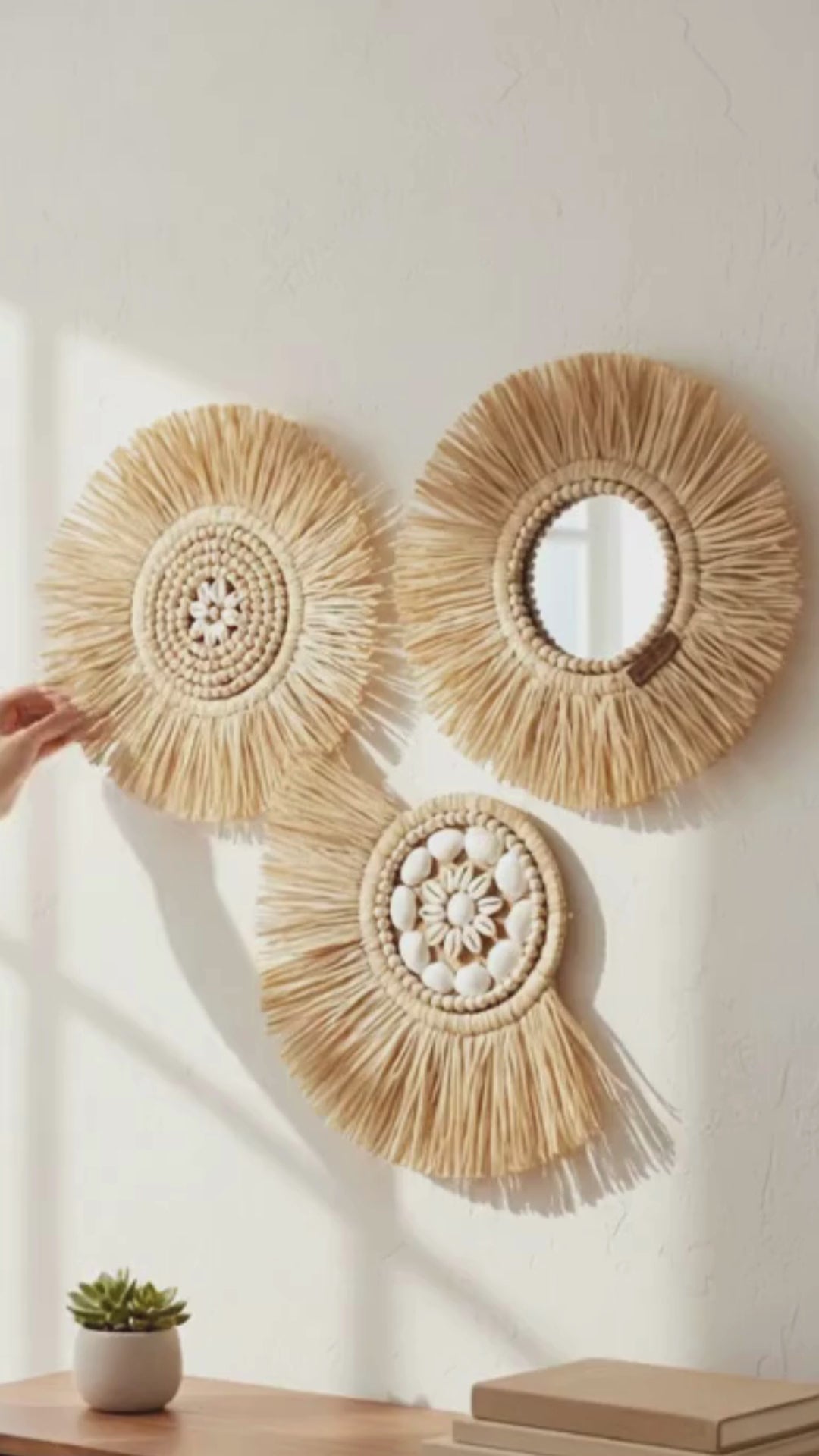 Doğal Hasır Ayna ve Duvar Süsü 3’lü Set – Bohem, Rustik, Sahil Evi Dekorasyonu